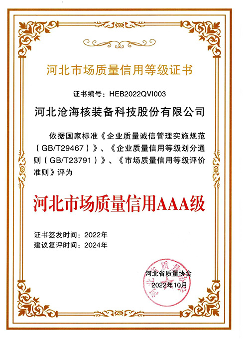 河北滄海河北市場(chǎng)質(zhì)量信用等級(jí)證書(shū)